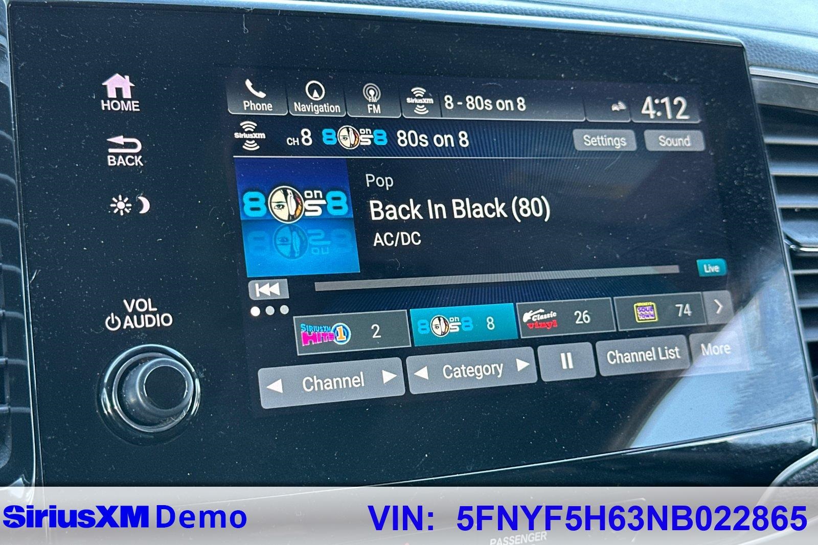 CARFAX One-Owner. Clean CARFAX. Crystal Black Pearl 2022 Honda Pilot Touring 7 Passenger FWD 9-Speed Automatic 3.5L V6 24V SOHC i-VTEC CARFAX ONE OWNER, NON-SMOKER, Leather Seats, Backup Camera, Bluetooth, Moonroof, Alloy Wheels, Aluminum Wheels, Climate Package, Heat Package, Light Package, Power Mirror Package, Power Package, Sunroof/Moonroof, Pilot Touring 7 Passenger, 4D Sport Utility, 3.5L V6 24V SOHC i-VTEC, 9-Speed Automatic, FWD, 10 Speakers, 3rd row seats: split-bench, 4-Wheel Disc Brakes, 4.33 Axle Ratio, A/V remote: CabinControl, ABS brakes, Air Conditioning, Alloy wheels, AM/FM radio: SiriusXM, Apple CarPlay/Android Auto, Auto High-beam Headlights, Auto-dimming Rear-View mirror, Automatic temperature control, Blind Spot Information (BSI) System warning, Brake assist, Bumpers: body-color, Compass, Delay-off headlights, Driver door bin, Driver vanity mirror, Dual front impact airbags, Dual front side impact airbags, Electronic Stability Control, Emergency communication system: HondaLink, Exterior Parking Camera Rear, Forward collision: Collision Mitigation Braking System (CMBS) + FCW mitigation, Four wheel independent suspension, Front Bucket Seats, Front Center Armrest, Front dual zone A/C, Front fog lights, Front reading lights, Fully automatic headlights, Garage door transmitter: HomeLink, Headphones, Heated door mirrors, Heated Front Bucket Seats, Heated front seats, Heated rear seats, Illuminated entry, Lane departure: Lane Keeping Assist System (LKAS) active, Leather Seat Trim, Low tire pressure warning, Memory seat, Navigation system: Honda Satellite-Linked Navigation System, Occupant sensing airbag, Outside temperature display, Overhead airbag, Overhead console, Panic alarm, Passenger door bin, Passenger vanity mirror, Power door mirrors, Power driver seat, Power Liftgate, Power moonroof, Power passenger seat, Power steering, Power windows, Radio data system, Radio: 590-Watt Premium Audio System, Rear air conditioning, Rear audio controls, Rear reading lights, Rear window defroster, Rear window wiper, Reclining 3rd row seat, Remote keyless entry, Roof rack: rails only, Security system, Speed control, Speed-sensing steering, Speed-Sensitive Wipers, Split folding rear seat, Spoiler, Steering wheel mounted audio controls, Tachometer, Telescoping steering wheel, Tilt steering wheel, Traction control, Trip computer, Turn signal indicator mirrors, Variably intermittent wipers, Wheels: 20" Machine-Finished Alloy.