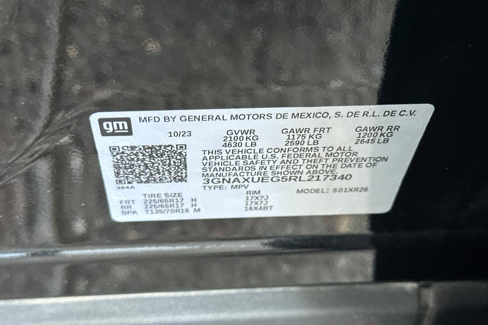 New Price! CARFAX One-Owner. Clean CARFAX. Mosaic Black Metallic 2024 Chevrolet Equinox LT AWD 6-Speed Automatic Electronic with Overdrive 1.5L DOHC CARFAX ONE OWNER, NON-SMOKER, Backup Camera, Bluetooth, Alloy Wheels, Aluminum Wheels, Climate Package, Heat Package, Light Package, Power Mirror Package, Power Package, Remote Start, Equinox LT, 4D Sport Utility, 1.5L DOHC, 6-Speed Automatic Electronic with Overdrive, AWD, Mosaic Black Metallic, Jet Black w/Premium Cloth Seat Trim, 17" Aluminum Wheels, 2 Rear USB Charging-Only Ports, 2 USB Ports & Auxiliary Input Jack, 2-Way Power Driver Lumbar Control Seat Adjuster, 3.87 Final Drive Axle Ratio, 4-Wheel Disc Brakes, 6 Speakers, 6-Speaker Audio System Feature, ABS brakes, Air Conditioning, Alloy wheels, AM/FM radio: SiriusXM, Auto High-beam Headlights, Automatic temperature control, Bluetooth® For Phone, Brake assist, Bumpers: body-color, Compass, Delay-off headlights, Driver 8-Way Power Seat Adjuster, Driver door bin, Driver vanity mirror, Dual front impact airbags, Dual front side impact airbags, Electronic Stability Control, Emergency communication system: OnStar and Chevrolet connected services capable, Four wheel independent suspension, Front Bucket Seats, Front Center Armrest, Front dual zone A/C, Front Passenger 4-Way Manual Seat Adjuster, Front reading lights, Fully automatic headlights, Heated door mirrors, Heated Driver & Front Passenger Seats, Heated front seats, Illuminated entry, Low tire pressure warning, Occupant sensing airbag, Outside temperature display, Overhead airbag, Overhead console, Panic alarm, Passenger door bin, Passenger vanity mirror, Power door mirrors, Power driver seat, Power Liftgate, Power steering, Power windows, Preferred Equipment Group 1LT, Premium audio system: Chevrolet Infotainment 3, Premium Cloth Seat Trim, Radio data system, Radio: Chevrolet Infotainment 3 System w/AM/FM, Rear reading lights, Rear seat center armrest, Rear window defroster, Rear window wiper, Remote keyless entry, Security system, SiriusXM, Speed control, Speed-sensing steering, Split folding rear seat, Spoiler, Steering wheel mounted audio controls, Tachometer, Telescoping steering wheel, Tilt steering wheel, Traction control, Trip computer, Variably intermittent wipers.